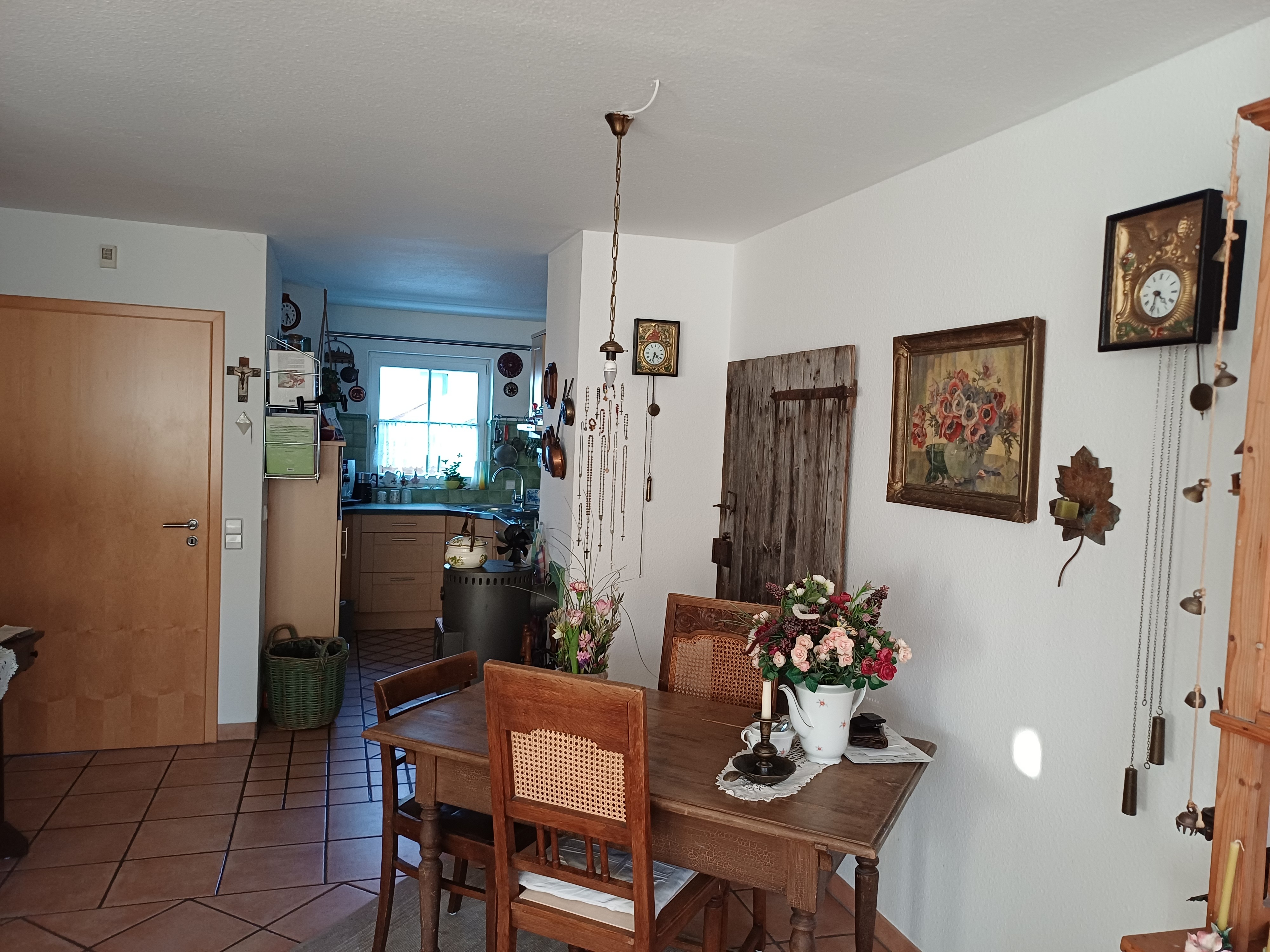 Der Wohn/Essbereich, mit Schwedenofen, sowie die Küche ist offen gehalten und Lichtdurchflutet. Vom Wohnbereich geht es auf die sonnige Terrasse.