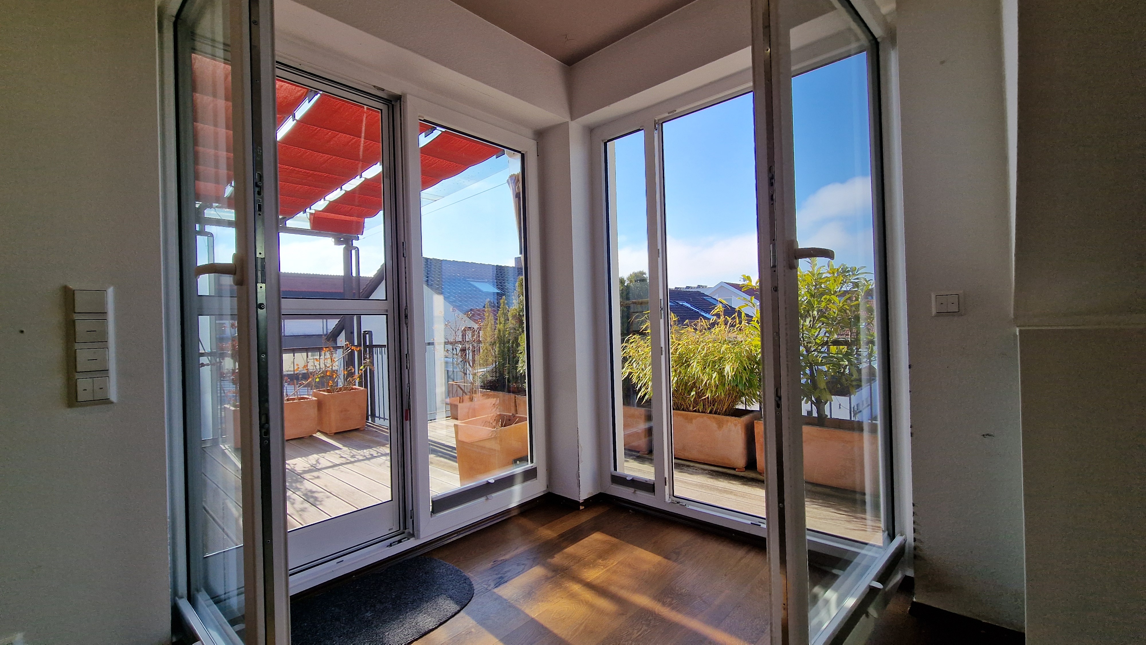 – Dachterrasse mit Überdachung aus Glas mit Tuchsonnenbespannung,